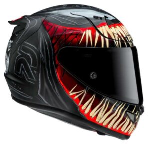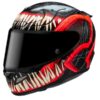 La edición RPHA 12 Venom 3, ofrece un diseño impactante que muestra la oscura y temible sonrisa de Venom, con sus afilados dientes expuestos audazmente en la parte frontal e inferior del casco. HJC ha incorporado un nuevo enfoque estético, combinando acabados mate y brillantes que recorren toda la superficie del casco. La característica lengua de Venom se extiende por el lateral, destacada por un sutil detalle de saliva que realza aún más el diseño. Los feroces ojos sobresalen sobre un elegante fondo negro, capturando a la perfección la naturaleza impredecible y salvaje del simbionte.
